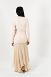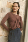 La silueta es ceñida, pero flexible, lo que permite que se adapte con naturalidad a la forma del cuerpo, resaltando con elegancia la cintura y el busto. El escote redondo cerrado aporta equilibrio y minimalismo, contrastando con la fluidez del drapeado lateral. La prenda culmina en un diseño clásico tipo body con broche inferior para un ajuste seguro y discreto.
